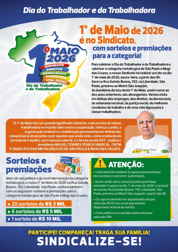 Para celebrar o Dia do Trabalhador e da Trabalhadora e valorizar a categoria metalúrgica de São Paulo e Mogi das Cruzes, o nosso Sindicato irá realizar um ato no dia 1º de maio de 2026, sexta-feira, a partir das 8h.