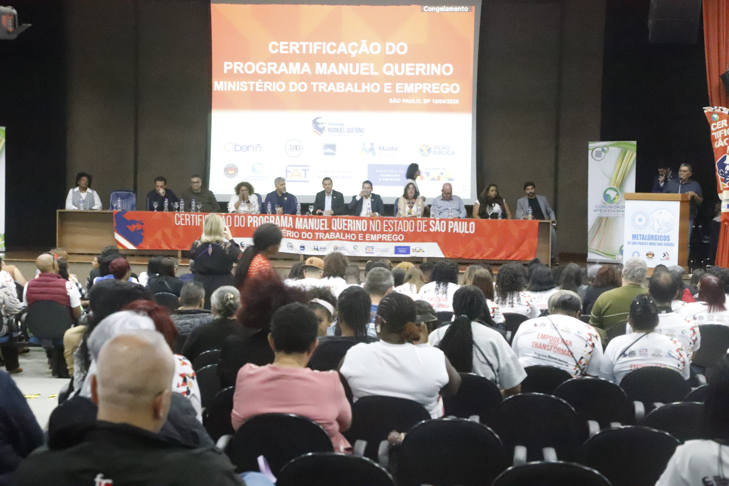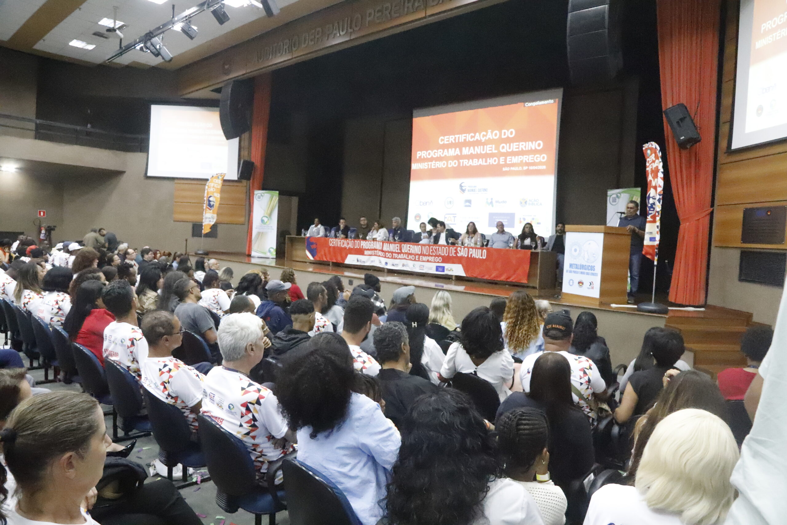 Cerimônia do Programa Manuel Querino reúne centenas de pessoas no Auditório do Sindicato dos Metalúrgicos SP e Mogi, em São Paulo, com certificação, ações de empregabilidade e foco na inclusão produtiva