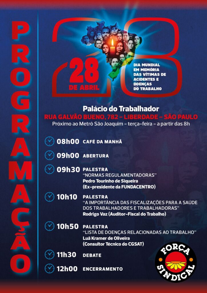 A Força Sindical realizará palestras no 28 de Abril, Dia Mundial em Memória das Vítimas de Acidentes e Doenças do Trabalho, fortalecendo a conscientização nacional.