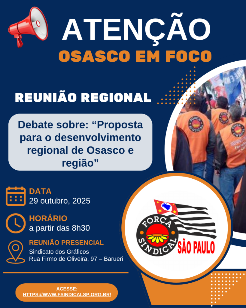 A Força Sindical São Paulo, por meio da regional de Osasco, convocou os sindicatos filiados para uma reunião estratégica sobre o desenvolvimento regional da Grande Osasco.