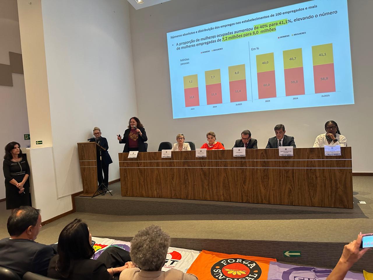 A presidente do Sindbrinq (STTI Instrumentos Musicais e Brinquedos), Secretária nacional de políticas para mulheres e gênero da Força Sindical e 1ª Secretaria da FEQUIMFAR, Maria Auxiliadora dos Santos, participou da apresentação do 4º relatório de igualdade salarial, realizada em Brasília.
