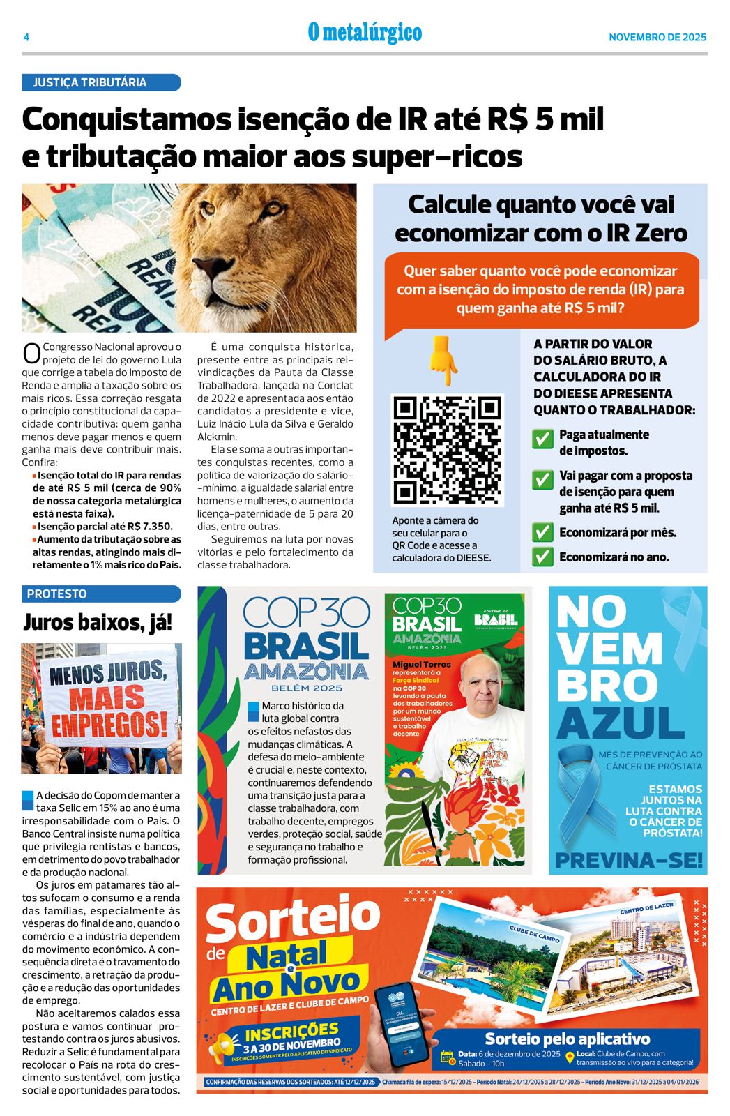Outros destaques incluem defesa por juros mais baixos, participação ativa na COP30, campanhas de saúde, sorteios de fim de ano e fortalecimento contínuo da organização metalúrgica.