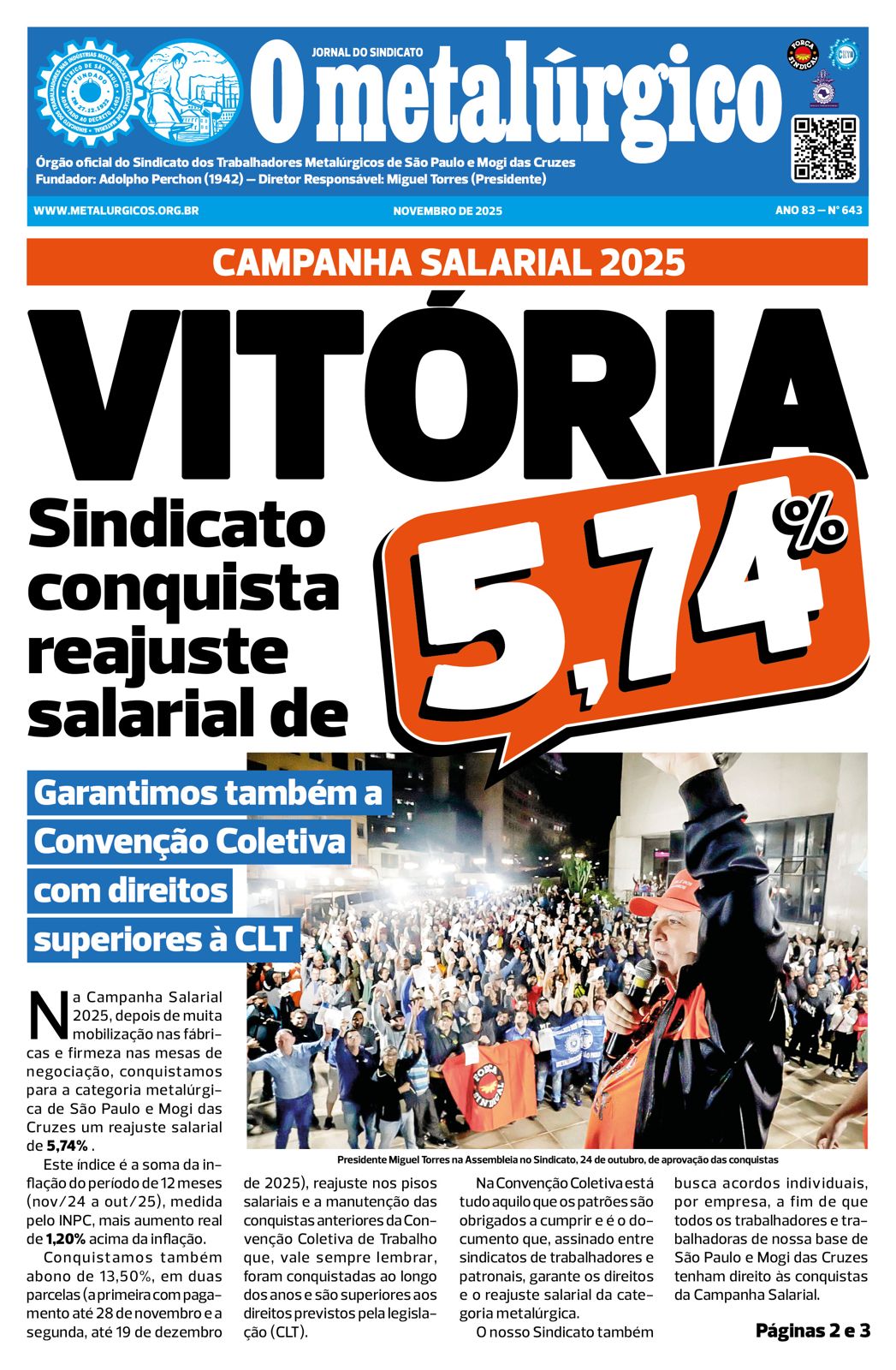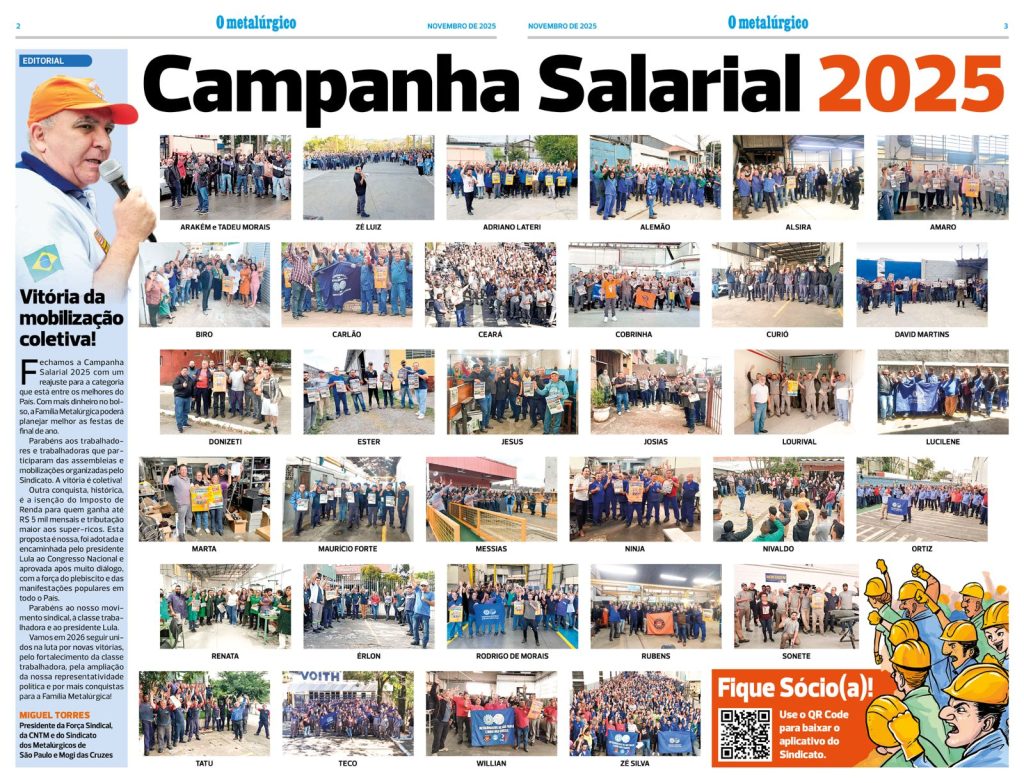 O jornal do Sindicato dos Metalúrgicos de São Paulo e Mogi, “O Metalúrgico”, destaca a vitória da categoria com reajuste salarial de 5,74%, conquistado após intensa mobilização nas fábricas e negociações firmes conduzidas pelo Sindicato durante o ano de 2025.