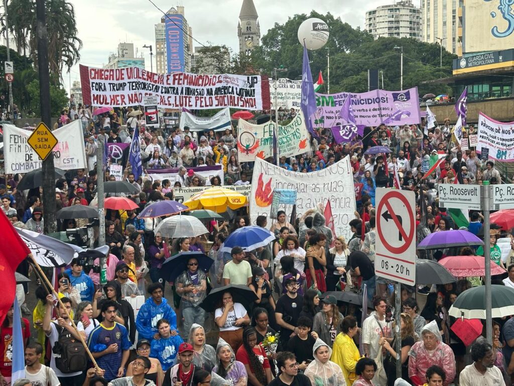 Mesmo sob alerta de chuva, milhares de mulheres, trabalhadoras, sindicatos, centrais sindicais e movimentos sociais ocuparam as ruas para denunciar o crescimento dos casos de feminicídio.