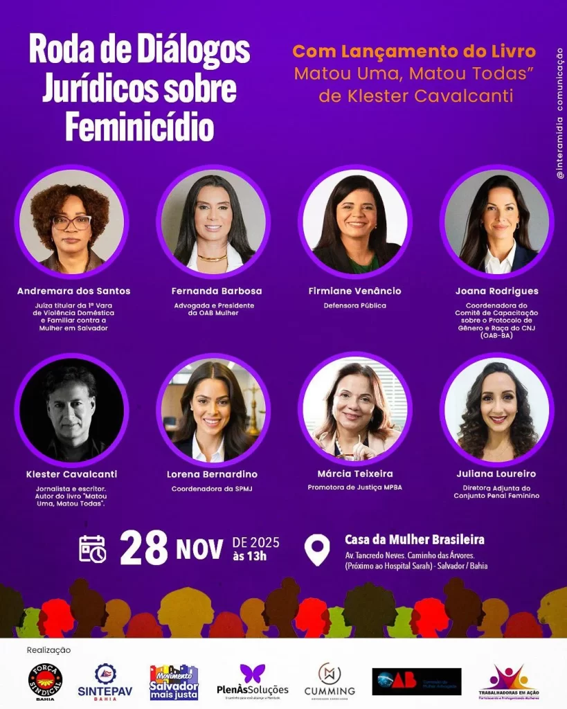Durante o encontro, também haverá o lançamento do livro “Matou Uma, Matou Todas”, de Klester Cavalcanti, ampliando o debate sobre o enfrentamento ao feminicídio no país.