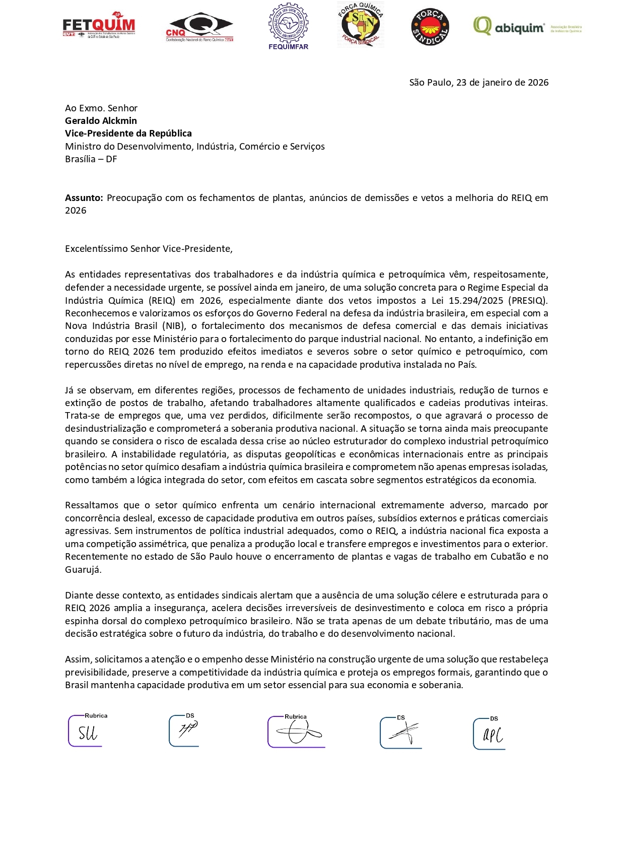 Representantes dos trabalhadores e da indústria química uniram forças e, assim, enviaram carta ao vice-presidente Geraldo Alckmin cobrando solução urgente para o REIQ a partir de 2026.