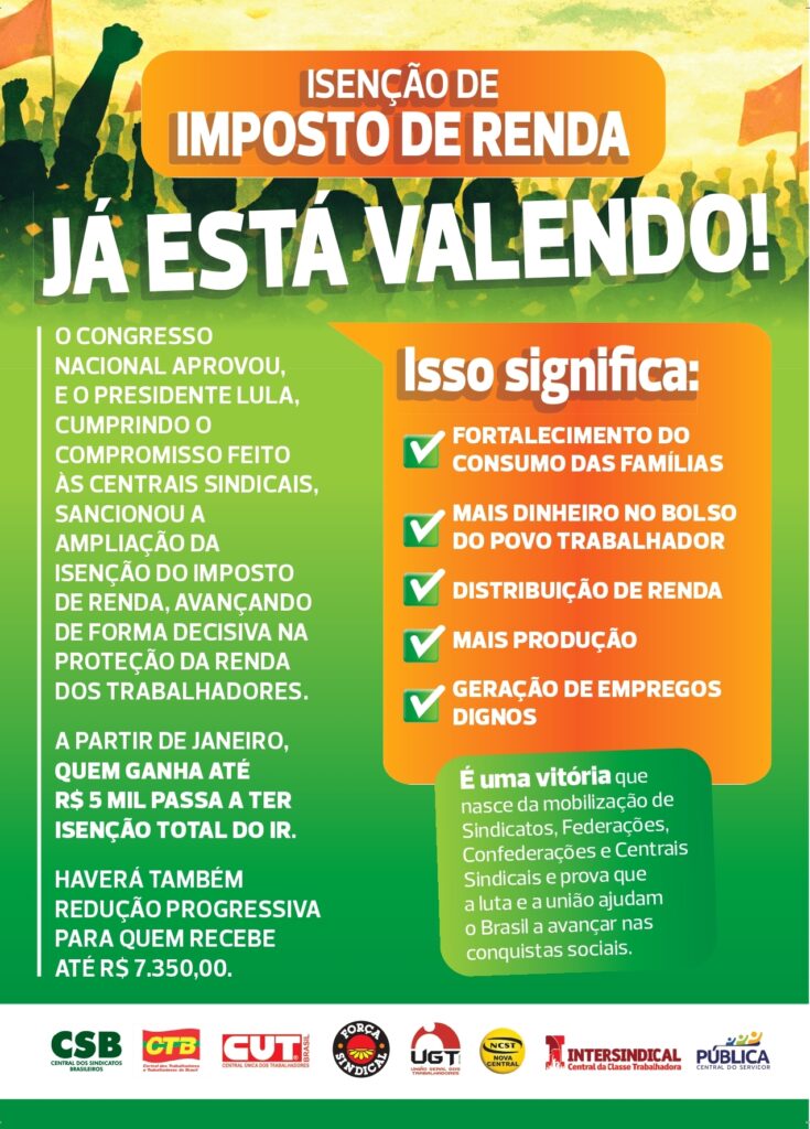Já está valendo a isenção do IR para quem ganha até R$ 5 mil e a redução gradual até R$ 7.350. Saiba mais no Boletim das Centrais Sindicais!