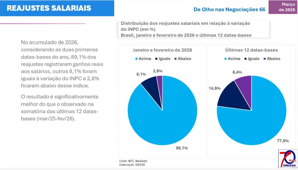 Além disso, em fevereiro, 88,6% dos reajustes registrados até 9 de março superaram a inflação medida pelo INPC, consolidando cenário positivo nas negociações coletivas.